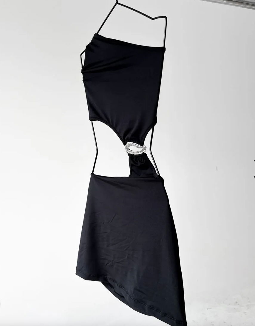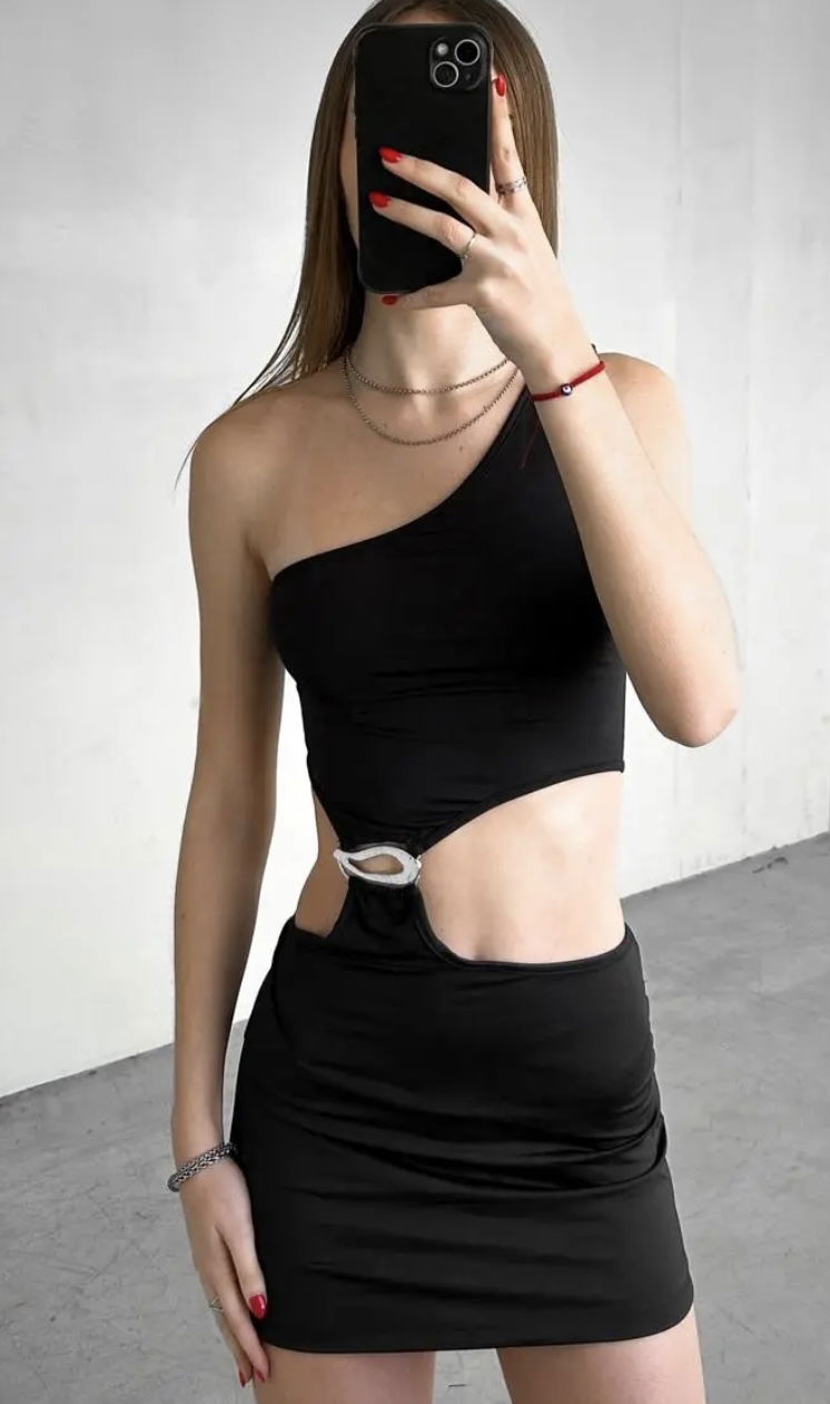 Vestido microfibra un hombro, abertura y accesorio.